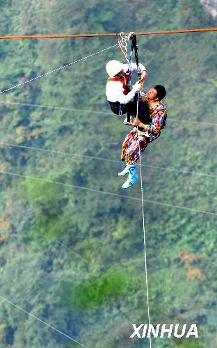 10月18日,新疆“達(dá)瓦孜”傳人賽買提·艾山在湖南張家界市天門山挑戰(zhàn)世界最大坡度高空走鋼絲時發(fā)生意外,在距終點(diǎn)50米處跌坐在鋼繩上,被迫放棄挑戰(zhàn)。意外發(fā)生后,地面安全人員及時展開救援,歷時1小時16分鐘將懸坐在400米高空鋼繩上的賽買提順利救出。 新華社記者龍弘濤攝