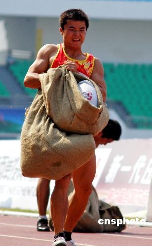 十月三十日,第六屆全國農(nóng)民運(yùn)動會田徑比賽在福建泉州海峽體育中心拉開帷幕后,進(jìn)行了男子60米麻袋跳搬運(yùn)糧食賽跑,選手一開始要腳套在麻袋里用彈跳的方式“跳”到糧食袋前,然后把50公斤重的“糧食”裝進(jìn)麻袋,再搬到終點,跳得快是關(guān)鍵。中新社發(fā) 傅丹丹 攝