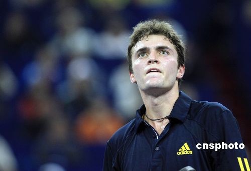 11月10日,在上海旗忠網(wǎng)球中心進(jìn)行的上海大師杯金組單打比賽中,世界網(wǎng)壇名將瑞士天王費(fèi)德勒苦戰(zhàn)3盤(pán),以1比2不敵法國(guó)小將西蒙,爆出本屆大師杯開(kāi)賽以來(lái)一大冷門(mén)。中新社發(fā) 湯彥俊 攝
