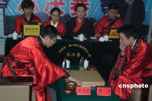11月19日,“永城杯”第二十一屆中國圍棋名人戰(zhàn)五番棋決賽第四局較量在河南省永城市進(jìn)行,古力九段在“福地”又下一城,執(zhí)黑289手中盤擊敗樸文堯五段,將總比分扳成2比2平,衛(wèi)冕冠軍的希望大增。圖為樸文堯(左)與古力在對(duì)局中。中新社發(fā) 沈晨 攝