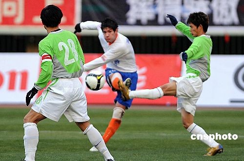 12月4日,中超全明星對抗賽在濟(jì)南打響,山東魯能(白)以6-7負(fù)于中超全明星隊(duì),2008聯(lián)賽就此落幕。 中新社發(fā) 張侃 攝