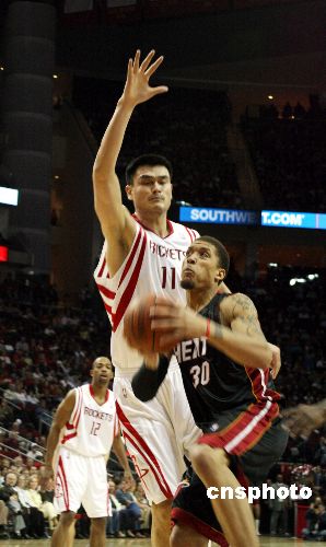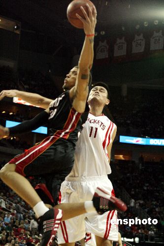 當(dāng)?shù)貢r間1月17日晚,主場作戰(zhàn)的火箭以93比86戰(zhàn)勝熱火,姚明全場十二投全中創(chuàng)個人進(jìn)攻記錄。中新社發(fā) 歐文 攝