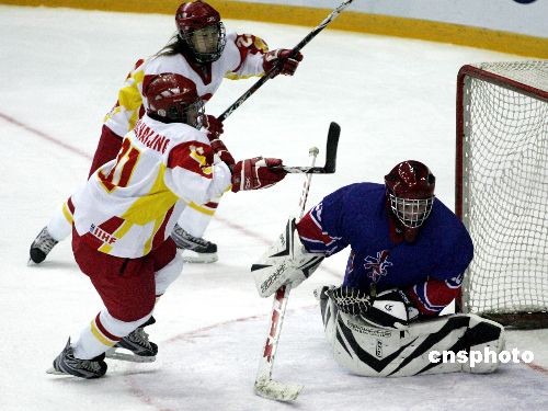 2月24日,第二十四屆世界大學生冬季運動會女子冰球小組賽最后一輪的比賽在哈爾濱冰球館結束,在晚間結束的比賽中,中國隊以8比0大勝英國。這樣中國女冰就以小組第二的身份晉級半決賽,在半決賽中她們將面對小組第三的芬蘭。圖為中國隊(白)破門得分。中新社發(fā) 富田 攝