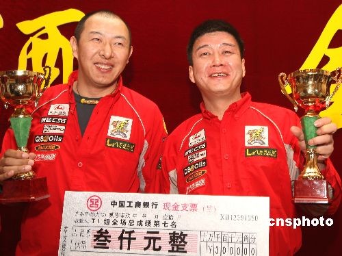 3月10日,經(jīng)過(guò)三天的激烈角逐,“金馬杯”第六屆漠河冰雪汽車越野賽暨全國(guó)汽車越野系列賽,在黑龍江省漠河縣境內(nèi)中俄界江黑龍江攝氏零下20多度的自然冰雪江面上結(jié)束,長(zhǎng)豐汽車華南虎車隊(duì)劉斌(右)在三天的比賽中兩次奪得“飛車王”獎(jiǎng),最終獲得全場(chǎng)“飛車王”獎(jiǎng)。中新社發(fā) 趙振清 攝