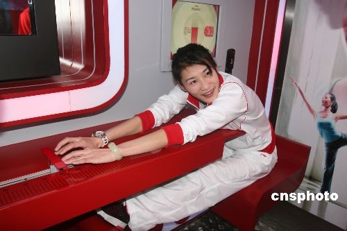 4月18日,悉尼奧運(yùn)會(huì)女子雙人10米臺(tái)跳水冠軍李娜在大篷車?yán)餃y試柔韌性。當(dāng)日,2009年“李寧英雄大篷車”巡游活動(dòng)在湖南岳陽啟動(dòng),體育愛好者們可通過大棚車?yán)锏母鞣N設(shè)備來測試自己的速度、柔韌、靈敏、平衡等運(yùn)動(dòng)素質(zhì),從而了解自身的各項(xiàng)運(yùn)動(dòng)機(jī)能水平。中新社發(fā) 鄧霞 攝