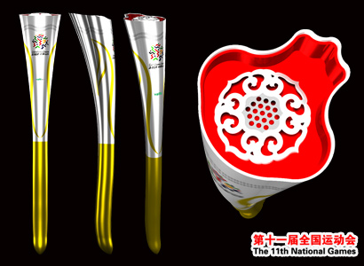 十一運(yùn)會(huì)火炬“如意”緊緊圍繞“和諧中國(guó)、全民全運(yùn)”的主題,外形由中國(guó)傳統(tǒng)吉祥物件“如意”演變而來(lái),取“如意和諧,吉祥美好”之寓意。火炬整體由金銀兩色組成,出火口借鑒元代青花瓷荷花紋飾,殼體采用漢代柳葉紋飾裝飾,突出了濟(jì)南“四面荷花三面柳”的城市特色。