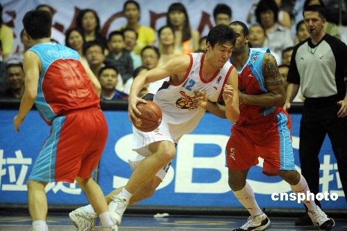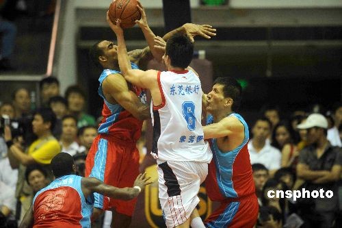 2009年5月3日晚,2008-09賽季CBA總決賽第5回合,廣東東莞銀行隊(duì)(白)在東莞體育館主場(chǎng)再戰(zhàn)新疆廣匯隊(duì)。進(jìn)入總決賽以來(lái)兩隊(duì)在主客場(chǎng)已戰(zhàn)罷4個(gè)回合,廣東隊(duì)暫以3比1領(lǐng)先。終場(chǎng)廣東隊(duì)以106比95戰(zhàn)勝新疆隊(duì),從而以5戰(zhàn)4勝的成績(jī)第五次捧起CBA總決賽至尊寶鼎。 中新社發(fā) 吳峻 攝