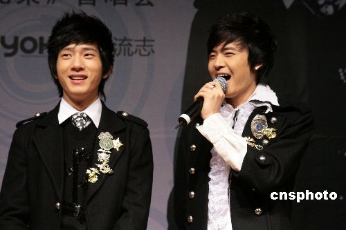 2007年10月22日,由“加油好男兒”的井柏然和付辛博組成的偶像團(tuán)體BOBO組合在北京舉辦了他們的首唱會(huì)。會(huì)上他們不僅載歌載舞與歌迷互動(dòng),還收到了大師兄羽泉組合送來(lái)的禮物。中新社發(fā) 一可 攝