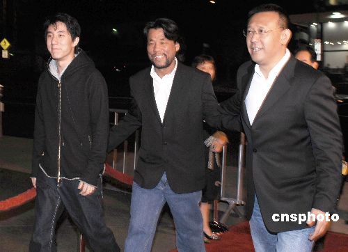 中美電影節(jié)十一月一日晚在好萊塢美國(guó)導(dǎo)演公會(huì)開(kāi)幕,中國(guó)影星及導(dǎo)演姜文(右)和成龍之子房祖名(左)一起走紅地毯,出席《太陽(yáng)照常升起》北美首映式。中新社發(fā) 賈國(guó)榮 攝