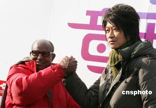 2008年1月2日下午,在北京林業(yè)大學(xué)體育場里,臺(tái)灣歌手游鴻明同坦桑尼亞奧運(yùn)英雄阿赫瓦里共同完成奧運(yùn)歌曲音樂電視《英雄》的場景拍攝。 中新社發(fā) 博芽影像 攝