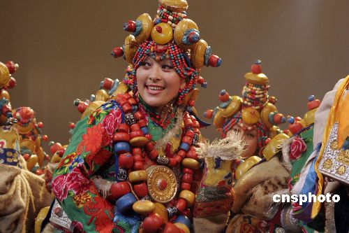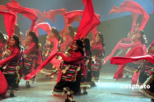 2008年1月21日,著名舞蹈家楊麗萍攜《藏謎》在海口人民大會堂上演!恫刂i》以藏族老阿媽虔誠的朝拜路途中所見為主線,表現了藏區(qū)牧民生活、民間習俗、宗教儀式場景。主創(chuàng)人員用了1年多的時間,行走在藏、青、川、云等各省區(qū)的20多個藏區(qū),大量收集了音樂、舞蹈、器樂、服裝等作為原始創(chuàng)作素材。劇中8成以上的演員都是藏區(qū)的牧民,完全是原生態(tài)的演出。中新社發(fā) 尹恩彪 攝