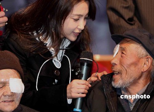 中國演藝明星李冰冰,1月28日在陜西省蒲城慰問剛剛通過慈善手術(shù)復(fù)明的貧困農(nóng)民白內(nèi)障患者。當(dāng)日揭牌的“陜西蒲城‘亮睛’扶貧眼科中心”,是由香港醫(yī)學(xué)界熱心人士發(fā)起、在香港注冊(cè)成立的“亮睛工程慈善基金”實(shí)施的“亮睛工程”的一部分,該工程計(jì)劃未來五年在中國人口多的貧困地區(qū)設(shè)立100個(gè)扶貧眼科中心(亮睛點(diǎn)),每個(gè)中心每年實(shí)施1000例白內(nèi)障手術(shù),大力協(xié)助中國的扶貧除盲重任。中新社發(fā) 任晨鳴 攝