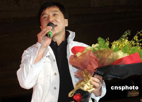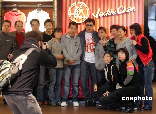 1月29日晚,二00八奧運(yùn)會(huì)形象大使、著名國際功夫巨星成龍來到昆明,出席在翠湖會(huì)舉行的“Jackie Chan杰克成08春夏新裝發(fā)布會(huì)”。中新社發(fā) 甘娜 攝