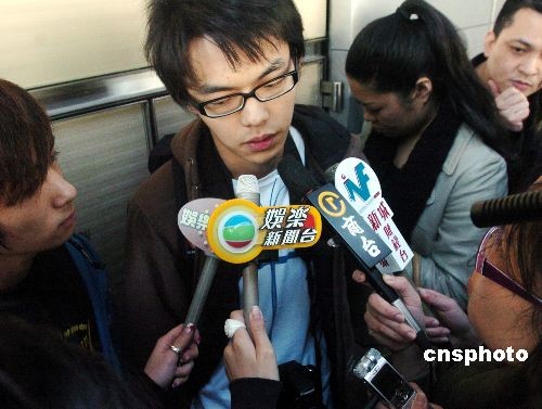 二月二十一日,涉及網(wǎng)上藝人不雅照片的藝人陳冠希在香港召開記者會(huì)。場(chǎng)外有陳冠希的“粉絲”在會(huì)場(chǎng)外支持,成為傳媒追訪對(duì)象。中新社發(fā) 鄧慶樂(lè) 攝