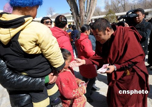 拉薩大昭寺的僧人到拉薩救助站慰問打砸搶燒事件中的受害者。