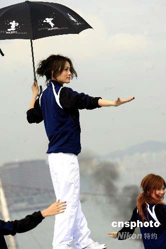 香港無(wú)線電視08北京奧運(yùn)主題曲《光輝大地》四月二十一日在中環(huán)碼頭樓頂隆重錄制,陳奕迅、容祖兒等八十多位藝員頭頂烈日排練演唱,“奧運(yùn)、爭(zhēng)口氣,會(huì)創(chuàng)造奇跡”等鏗鏘有力的歌聲在維港上空回蕩。圖中容祖兒在演唱。作者: 王麗南