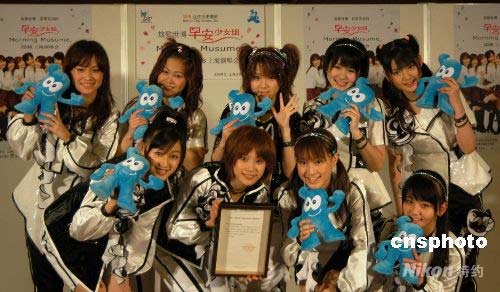 4月29日,上海世博會組委會邀請日本人氣組合早安少女參加“放歌世博”上海演唱會的新聞發(fā)布會在東京中野Sun Plaza舉行。去年首次吸收兩位中國籍成員“純純”和“琳琳”的早安少女組合,目前致力于亞洲市場,已在日本、韓國以及臺灣地區(qū)成功舉行大型演唱會。2008年6月28日在上海舉行的早安少女組合“放歌世博”上海演唱會,將是該組合第一次來到中國大陸地區(qū)舉辦演唱會,她們也是上海世博會“放歌世博”大型演唱活動邀請的第一個日本藝人(組合)。圖為早安少女組合開心地與獲贈的上海世博會吉祥物“海寶”合影。前排右一、右二分別為中國籍成員李純、錢琳。中新社發(fā) 關妍 攝