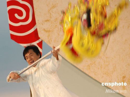 北京奧運會火炬接力三亞傳遞于五月四日晚六時左右圓滿結束,最后一棒火炬手之一的著名影星成龍在當日晚舉行的晚會上表演《鳳舞天涯》。 中新社發(fā) 王辛莉 攝