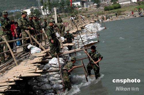 5月26日,中國(guó)空降兵某部官兵在水中打樁加固,架設(shè)橫跨涪江的臨時(shí)橋梁。汶川地震后,四川平武縣南壩鎮(zhèn)災(zāi)區(qū)通向外界的道路橋梁被毀壞,數(shù)百名重傷員和2萬多名受困群眾被困在涪江對(duì)岸、受到涪江段堰塞湖潰堤威脅。在此救援的中國(guó)空降兵某師決定,在涪江上架設(shè)一座低水橋,打開生命通道,確保群眾安全轉(zhuǎn)移。經(jīng)過四晝夜施工,一座長(zhǎng)達(dá)110多米、橫跨涪江的“救命橋”在水流湍急的江面成功合攏。中新社發(fā) 譚超 攝