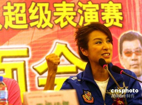 7月5日,香港明星足球隊(duì)代表米雪、成奎安、羅家英和泰迪羅賓在重慶參加“2008中國·重慶香港明星足球隊(duì)超級表演賽新聞媒體見面會”,為表演賽宣傳造勢。圖為香港明星足球隊(duì)啦啦隊(duì)隊(duì)長米雪回答記者提問。中新社發(fā) 郭晉嘉 攝