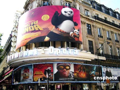 7月9日,全球熱映的電影《功夫熊貓》在法國開映,影片中活潑的熊貓和中國功夫受到觀眾追捧,圖為巴黎一家電影院的《功夫熊貓》大幅廣告。中新社發(fā) 王倩 攝