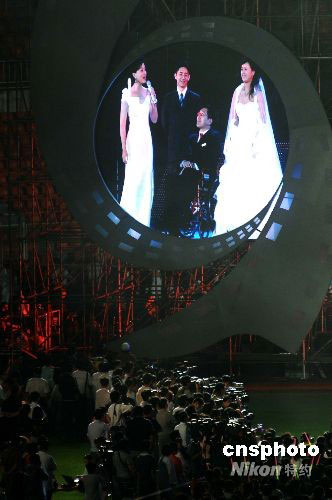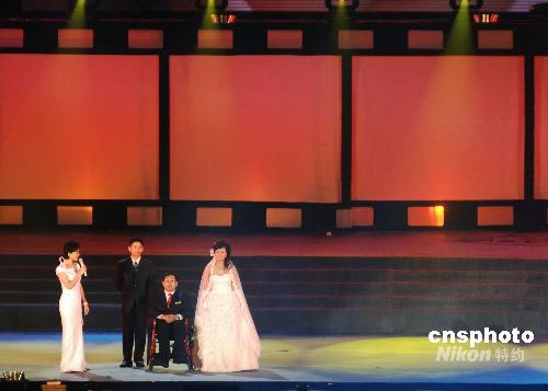 9月10日晚,在遼寧大連市舉行的第17屆金雞百花電影節(jié)開幕式上,高位截癱的大連志愿者、2008年殘奧會(huì)火炬手韓偉與女友陶璐舉行現(xiàn)場(chǎng)婚禮,并講述兩人因?yàn)殡娪岸Y(jié)緣的故事。在觀眾的見證下,兩人現(xiàn)場(chǎng)許下愛的誓言,交換婚戒。他們的愛情故事感動(dòng)了現(xiàn)場(chǎng)的觀眾。影星鄧超為他們送上了自己的祝福。中新社發(fā) 劉德斌 攝