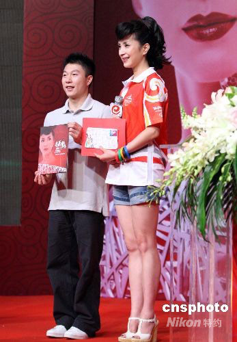 9月21日,素有“時尚民歌天后”之稱的青年歌手湯燦在北京推出為北京奧運健兒量身定制的單曲《光榮與夢想》。奧運體操冠軍李小鵬到場祝賀,并向湯燦贈送中國全體奧運冠軍親筆簽名的奧運首日封。中新社發(fā) 廖文靜 攝