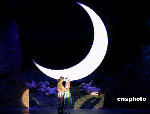 2008年11月7日晚,由寧夏銀川藝術(shù)劇院創(chuàng)作的中國(guó)第一部大型原創(chuàng)回族舞劇《月上賀蘭》在福州進(jìn)行專(zhuān)場(chǎng)慰問(wèn)演出。舞劇反映了在千百年前的古絲綢之路上,一支來(lái)自西域的商隊(duì)歷經(jīng)艱險(xiǎn),在當(dāng)?shù)貪h族及其他少數(shù)民族的幫助下,戰(zhàn)勝各種困難,完成了穿越沙漠、東渡黃河的商旅使命。在這一過(guò)程中,來(lái)自西域的青年納蘇與漢地姑娘海真相互愛(ài)慕,產(chǎn)生了真摯的愛(ài)情。也正是這種真愛(ài),超越了民族、信仰、習(xí)俗的界限,使這一對(duì)戀人在賀蘭山下結(jié)為夫婦,繁衍生息。舞劇以其曲折的劇情、優(yōu)美的舞姿、豪華的燈光和富有真實(shí)感的布景,贏得了觀眾的高度贊揚(yáng)。中新社發(fā) 汪虎 攝