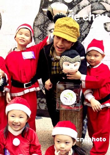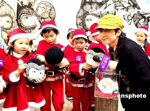 十二月一日,香港藝人古巨基與十位天真可愛(ài)的小小圣誕老人在時(shí)代廣場(chǎng)一起為護(hù)苗基金籌款。中新社發(fā) 張勤 攝