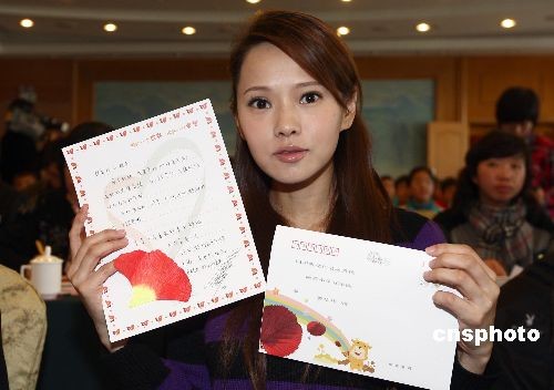12月22日,愛(ài)心大使伊能靜在北京出席“新長(zhǎng)城5·12災(zāi)區(qū)學(xué)生新春關(guān)愛(ài)行動(dòng)”啟動(dòng)儀式,并在愛(ài)心賀卡上親手為四川災(zāi)區(qū)小學(xué)生寫(xiě)下新年祝福,這封賀卡將寄往映秀小學(xué)5年紀(jì)的賀華偉同學(xué)。參加活動(dòng)的市民只需花費(fèi)10元人民幣,就可為災(zāi)區(qū)學(xué)生郵寄一枚新年愛(ài)心賀卡,其中還包含有為“自強(qiáng)獎(jiǎng)學(xué)金”捐獻(xiàn)的善款。首批賀卡是寄給映秀小學(xué)學(xué)生的,他們將最先收到這份新年禮物。中新社發(fā) 杜洋 攝