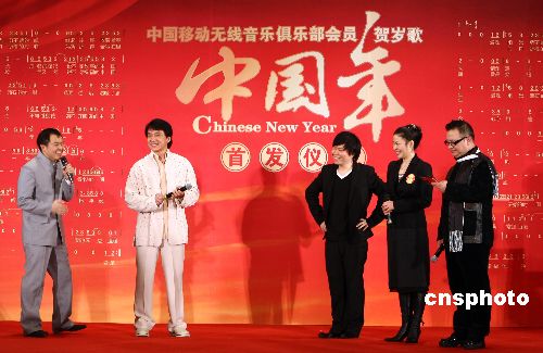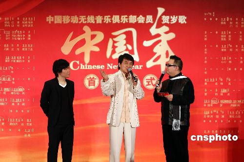 1月17日,由中國(guó)移動(dòng)無線音樂俱樂部與北京風(fēng)向樂動(dòng)數(shù)字音樂公司共同打造的賀歲歌《中國(guó)年》在京首發(fā),并傳至中國(guó)移動(dòng)無線音樂門戶供大家下載!吨袊(guó)年》由王平久作詞,北京奧運(yùn)會(huì)開幕式音樂團(tuán)隊(duì)核心成員常石磊作曲,并由成龍、譚晶、常石磊演唱,曾在奧運(yùn)歌曲創(chuàng)作、演唱中有突出表現(xiàn)的三人如今組成特殊的奧運(yùn)組合,共同用歌聲來拜年。中新社發(fā) 杜洋 攝