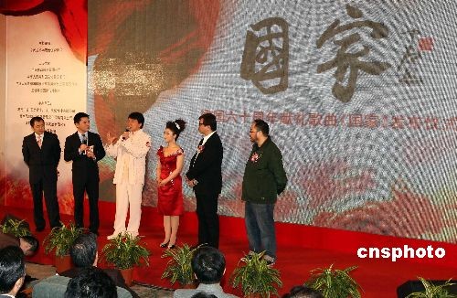 2月28日,國慶60周年獻禮歌曲《國家》在北京人民大會堂舉行發(fā)布儀式。海內(nèi)外華人音樂者全情投入,協(xié)力打造成為這首主旋律歌曲的一大亮點。中國移動將利用無線音樂平臺對其進行全程推廣,使這首歌跨越空間的阻隔,向全球華人傳遞信心與力量。國際巨星成龍專程從云南拍片現(xiàn)場趕來參加歌曲發(fā)布儀式,F(xiàn)場通過視頻播放鋼琴巨星郎朗從紐約錄制傳來的創(chuàng)作感言。作曲家金培達、音樂制作人余秉翰來自香港。參加發(fā)布儀式的還有來自北京的總策劃之一、詞作者王平久和演唱者劉媛媛。中新社發(fā) 杜洋 攝