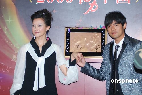 4月18日下午,“魅力相約 巔峰之和”中國(guó)北京鳥巢夏季音樂會(huì)開篇之作“2009《魅力·中國(guó)》”音樂會(huì)新聞發(fā)布會(huì)在北京舉行。6月30日,宋祖英將攜手歌劇大師多明戈、鋼琴巨星郎朗、流行天王周杰倫,在鳥巢上演一場(chǎng)音樂盛筵。宋祖英透露自己將在這場(chǎng)音樂會(huì)上演唱周杰倫的歌曲,直言最愛他的中國(guó)風(fēng)。圖為周杰倫和宋祖英一起在鳥巢留下明星手模,象征“《魅力·中國(guó)》夏季音樂會(huì)”正式啟動(dòng)。此后,他們兩人的手模也將與奧運(yùn)冠軍們的手模一起被永久珍藏起來。中新社發(fā) 李學(xué)仕 攝