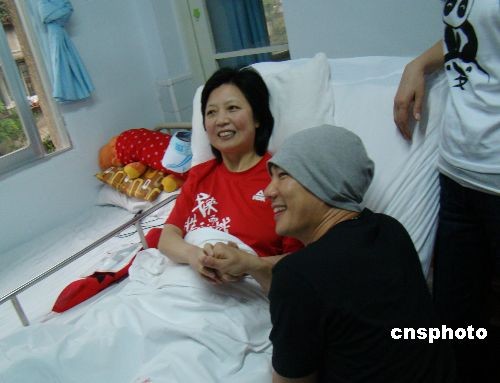 汶川大地震一周年之際,香港華光功德會(huì)愛心大使任賢齊、琦琦、汪詩(shī)詩(shī)一行于5月7日中午來(lái)到四川省人民醫(yī)院,探訪了仍然留院療傷的傷患者,并與地震傷員一起唱歌、游戲,還親手參與了“十字繡”等手工藝品的制作。此外,3人還一口氣簽下了65件愛心T恤,共同為地震傷員發(fā)起的“心啟程”活動(dòng)儲(chǔ)備愛心基金。圖為明星們到病房慰問傷員。中新社發(fā) 王萌 攝