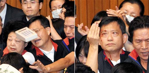 “真的很痛!”吳育升昨日臉上包著紗布,說明前天掛彩時,只感覺到一陣刺痛,“當(dāng)時看到有東西丟過來,我雖然有閃,但仍砸到我!碑(dāng)下“立法院長”王金平就站在他左邊,“如果我蹲下轉(zhuǎn)開,是不是就砸到王‘院長’了?”