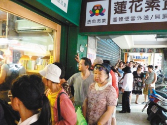 來自北市景美的吳姓婦人說,從上午11時(shí)開始排隊(duì)到下午2時(shí)才排到,雖然在騎樓下排了這么久但相當(dāng)值得,自己全家都吃素,相當(dāng)感謝老板和這位神秘客的愛心。