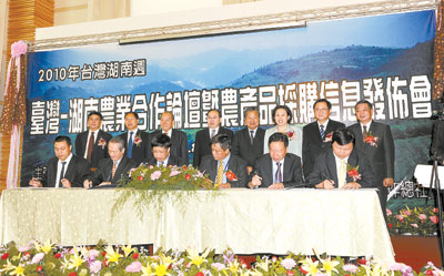 “2010年臺灣湖南周”期間,湖南代表團(tuán)成員在簽約、采購中奔忙。湘臺雙方共簽約投資合作項目41個,總投資16.17億美元;對臺采購協(xié)議41個,采購金額1.32億美元。