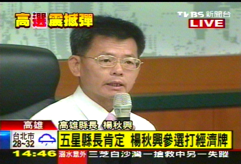 中新網(wǎng)8月9日電 據(jù)臺(tái)灣TVBS報(bào)道,高雄縣長(zhǎng)楊秋興9日下午在縣府舉行記者會(huì),正式宣布參選大高雄市長(zhǎng)選舉,并對(duì)外體說明決定和參選的心路歷程。