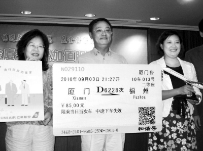 “11年前我就是搭第一班‘小三通’輪船去福州,今天(9月3日)又在臺灣買到了第一張動車火車票,真是感慨萬分。我上次回福州還要自己在廈門排隊買車票,這次就不用了,真是太方便啦!3日上午,福州臺商張鳴齡先生興奮地從臺灣三菱旅行社總經(jīng)理周惠全手里接過車票模型,宣告大陸動車車票在臺灣正式開賣。