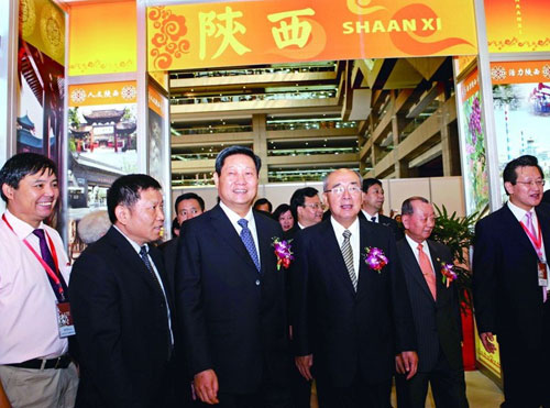 當(dāng)日上午九時(shí)許,在悠揚(yáng)古樸的秦腔曲牌聲中,“陜西風(fēng)情節(jié)”在臺(tái)北世貿(mào)中心拉開(kāi)帷幕,近百家企業(yè)的300多種產(chǎn)品吸引了諸多臺(tái)灣民眾。趙正永、景俊海和吳伯雄以及臺(tái)灣商業(yè)總會(huì)理事長(zhǎng)張平沼等在參觀展覽之后,出席了活動(dòng)開(kāi)幕式。趙正永在致辭中說(shuō),兩岸經(jīng)濟(jì)具有很強(qiáng)的互補(bǔ)性,不斷加強(qiáng)交流與合作,對(duì)于應(yīng)對(duì)國(guó)際金融危機(jī)和促進(jìn)經(jīng)濟(jì)持續(xù)發(fā)展具有重要意義。隨著“三通”的實(shí)現(xiàn),陜臺(tái)兩地的交流合作領(lǐng)域不斷擴(kuò)大、態(tài)勢(shì)越來(lái)越好。為進(jìn)一步凝聚共識(shí)、互惠發(fā)展,在臺(tái)灣有關(guān)方面的大力支持下,我們赴臺(tái)舉辦包括“陜西風(fēng)情節(jié)”等許多活動(dòng)在內(nèi)的“2010臺(tái)灣陜西周”,相信這次活動(dòng)會(huì)使臺(tái)灣企業(yè)和民眾更多地了解陜西,推動(dòng)陜臺(tái)合作向更高層次發(fā)展。吳伯雄在致辭中對(duì)我省舉辦臺(tái)灣陜西周表示熱烈歡迎,他說(shuō),秦中自古帝王州,陜西是中華文化的發(fā)祥地,工業(yè)基礎(chǔ)較好,資源豐富,有眾多的高校和科研單位,與臺(tái)灣有著良好的往來(lái),臺(tái)灣陜西周文化交流、認(rèn)親拜友、科技聯(lián)盟的主題,都是與臺(tái)灣合作中非常重要的問(wèn)題,陜西也具備這樣的條件和基礎(chǔ),希望以這次活動(dòng)為新的契機(jī),不斷推動(dòng)陜臺(tái)合作向更多更寬的領(lǐng)域發(fā)展。作為陜西省政府高級(jí)經(jīng)濟(jì)顧問(wèn)的張平沼,以切身經(jīng)歷說(shuō)明了大陸與臺(tái)灣加強(qiáng)合作的重要性,表達(dá)了進(jìn)一步加強(qiáng)合作的愿望。