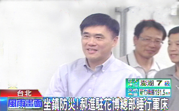 中新網(wǎng)9月19日電 據(jù)臺灣TVBS電視臺報道,臺北市長郝龍斌18日晚間進駐花博營運總部,聽取最新臺風動態(tài)簡報,簡報結束后,直接安排在總部過夜,就睡在一張簡單的行軍床上,隨時做好機動準備。