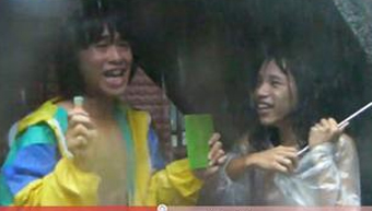 影片一開(kāi)始,出現(xiàn)一名戴著假發(fā),穿著透明雨衣,裸上半身只穿四角褲的男大學(xué)生,當(dāng)起記者來(lái),夸張地演出被強(qiáng)風(fēng)吹倒在地,不但藍(lán)色雨傘開(kāi)了花,整個(gè)人還翻了過(guò)去。接著竟然SNG連線起來(lái)。