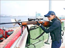 臺(tái)南市警察局相關(guān)單位昨在安平港演練船只遭外籍歹徒劫持勒索,從陸?杖姘献骶热,過程逼真。鄭蓮玉經(jīng)特殊任務(wù)警力訓(xùn)練合格,在反劫船任務(wù)演練中擔(dān)任狙擊手,持狙擊槍在頂樓瞄準(zhǔn)歹徒,準(zhǔn)備隨時(shí)配合行動(dòng)射擊,架式十足。