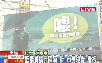 中新網(wǎng)10月1日電 據(jù)臺(tái)灣TVBS報(bào)道,高雄市長(zhǎng)陳菊坦承在919風(fēng)災(zāi)當(dāng)天下午,人在官邸休息,風(fēng)波持續(xù)延燒,藍(lán)營(yíng)議員昨天(9月30日)下午在高雄市中心,掛上調(diào)侃陳菊市長(zhǎng)的廣告牌,內(nèi)容是一名黑衣人回頭比“噓,市長(zhǎng)在睡覺”,極盡調(diào)侃之能事。
