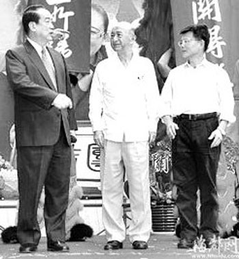 高雄縣長楊秋興13日參加親民黨籍議員李蕙蕙競選總部成立大會,與親民黨主席宋楚瑜及馬英九辦公室資政林淵源“同臺”,宋、楊兩人三度雙手緊握,互動引人關(guān)注。