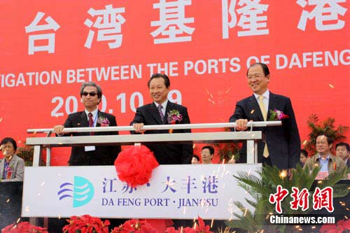 中新網(wǎng)鹽城10月19日電 (記者 于從文)19日上午11時(shí)18分,隨著中共鹽城市委書記趙鵬一聲宣布,鹽城地方政府官員與臺灣基隆港物流協(xié)會會長共同啟動拉桿,一艘“寶宏8號”貨輪緩緩離岸駛向臺灣基隆港,江蘇大豐港與臺灣基隆港實(shí)現(xiàn)首次直航。