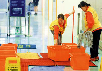 為了避免影響觀瞻,桃園航空站原本規(guī)定室內(nèi)漏水不得用水桶承接,只能用地毯或毛巾放在地上吸水,飽和后再擰到水桶搬走。可是昨天的漏水量太大,地毯及毛巾已經(jīng)無法應(yīng)付,清潔人員還是被迫搬來十多個水桶接水。