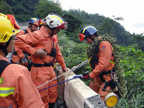 歷經(jīng)40分鐘路程,來(lái)到116公里處,前方已一大片塌方,無(wú)法再向前。不到片刻,一群身穿橘衣、步伐整齊的臺(tái)北市搜救隊(duì)朝這走來(lái)。在短暫的集合、下達(dá)指令后,搜救隊(duì)員系著繩索,一個(gè)接著一個(gè)從路邊護(hù)欄緩緩垂降,搜索生還者及車(chē)輛殘骸。