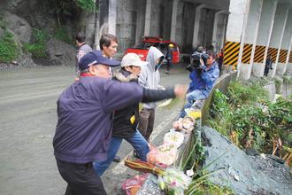 3日是事件發(fā)生后的“二七”,創(chuàng)意旅行團(tuán)司機(jī)郭銘麟兒子郭翔、導(dǎo)游曾慶華等家屬帶著鮮花、冥紙,原本要到蘇花公路114.5公里處祭拜,但是搭乘的車輛行駛過112.8公里處,突然有落石掉落,相當(dāng)危險,決定改在112.8公里祈福,難掩悲傷情緒。