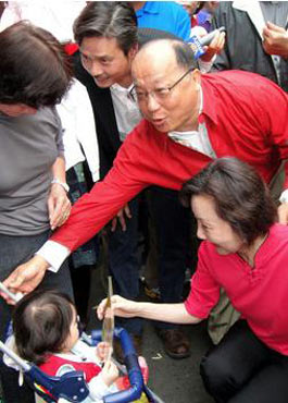 中新網(wǎng)11月11日電 據(jù)“中央社”報(bào)道,國民黨臺(tái)中市長(zhǎng)候選人胡志強(qiáng)11日起請(qǐng)假投入選舉,首場(chǎng)活動(dòng)即到臺(tái)中市北屯區(qū)金谷市場(chǎng)拜票,國民黨秘書長(zhǎng)金溥聰特別陪同,市場(chǎng)內(nèi)“凍蒜(當(dāng)選)”聲不絕于耳。